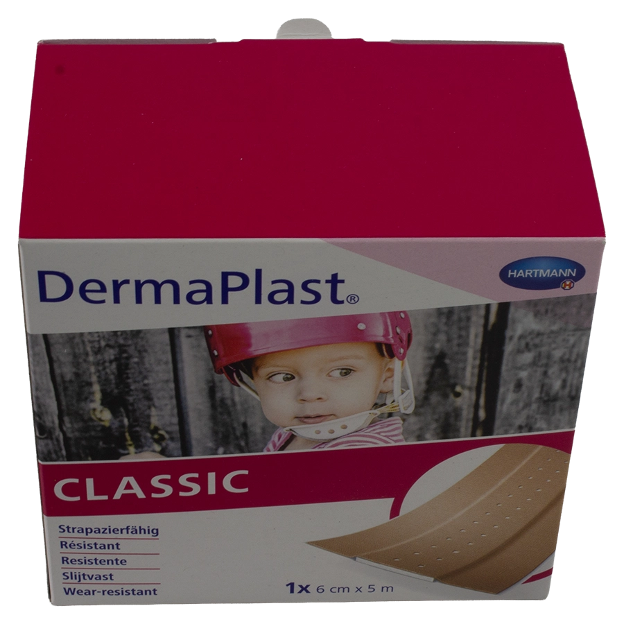 DermaPlast® CLASSIC Wundpflaster sind wirkstofffreie, selbstklebende, unsterile Produkte zum Einmalgebrauch, die aus einem selbstklebenden Trägermaterial (Rückseite) und einem mit Silikonpapier geschützten Wundkissen bestehen.