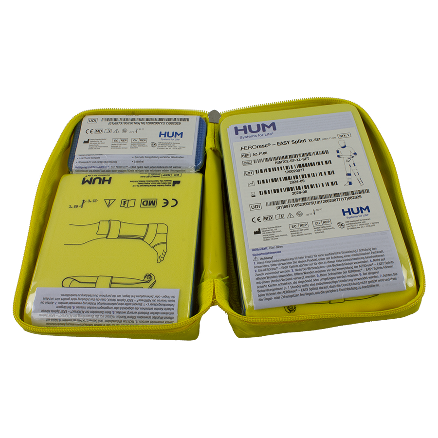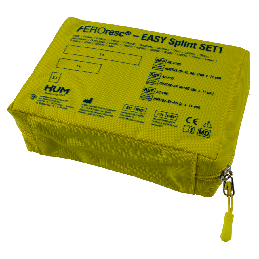 Die AEROresc® - EASY Splints sind Universalschienen zur Schienung nahezu aller menschlichen Gliedmaßen und der Halswirbelsäule. Hergestellt aus leichtem und röntgenstrahlendurchlässigem Material. Der Mantel besteht dabei aus Kunststoffschaum (IPXE) und der Kern aus einem weichem, modellierbarem Aluminiumgemisch. Für eine einfache Anwendung ist die Patientenseite „Blau“ und die Außenseite „Gelb“. Die patientenseitig strukturierte Oberfläche sorgt für einen sicheren Halt und eine bessere Luftzirkulation. Das Produkt ist außerdem Flüssigkeitsabweisend (z.B. gegen Blut, Sekret, Schweiß) und damit wiederverwendbar. Weitere Vorteile sind die Röntgenstrahlendurchlssigkeit, die Flexibilität und das geringe Gewicht des Produktes. Zudem lässt sich die Schiene kompakt und platzsparend verstauen und flexibel und je nach Bedarf zuschneiden. Das Produkt kann auch als Infusionsschiene eingesetzt werden. Mit dem Universalschienen-Set ist man für nahezu alle Notfallsituationen, in denen eine Immobilisation von menschlichen Gliedmaßen erforderlich ist, bestens ausgestattet. „Das Set 1“besteht aus 3 unterschiedlichen Schienengrößen, die in einer platzsparenden Einsatztasche untergebracht sind.