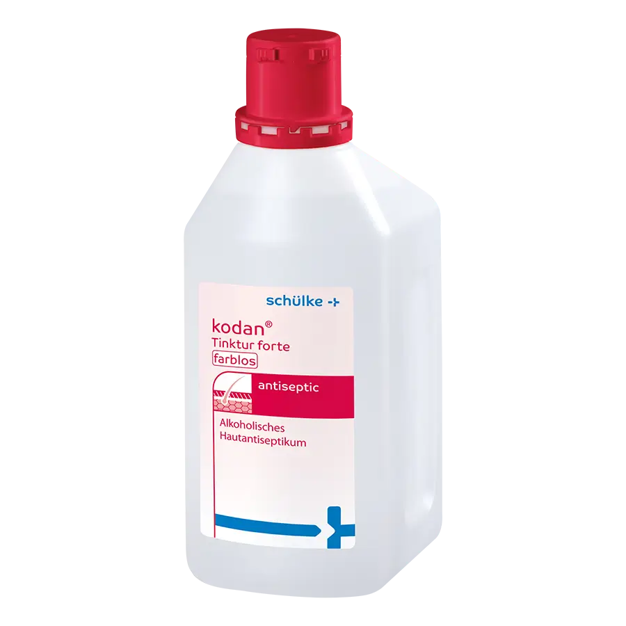 kodan® Tinktur forte farblos (1 Liter) ist ein gebrauchsfertiges Hautantiseptikum mit mindestens 24 Stunden Langzeitwirkung.